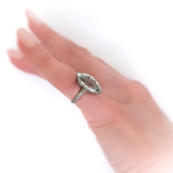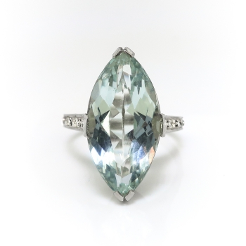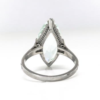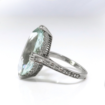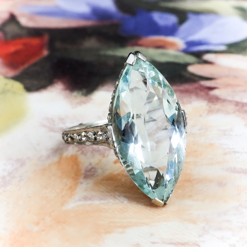 This ring is so special and unusual with it's fancy antique cut ice blue aquamarine and elaborate hand chase work and filigree! The exquisite & large antique marquise cut aquamarine is the ideal puffy marquise shape and no one will have this ring! It doesn't even need diamonds! This superb 1930's US origin ring is a true gem at a wonderful value, only from Jewelry Finds®! This Edwardian ring is nearly antique (antique means 100+ years or older, vintage means 20+ years or older, estate means pre-owned) and it comprises a single marquise mixed cut aquamarine set in four prongs atop a scalloped, pierced, millegrain-edged gallery, on an engraved, flat shank which measures from 1.70 to 2.56 mm in width. The aquamarine is eye clean, measures approximately 18.43 x 8.95 x 6.43 mm, and weighs approximately 5.49 carats. The ring is stamped “M.G. 18K” weighs 3.9 grams, and is currently a finger size 4.5. I can have my trusted jeweler re-size this for you at no additional charge, just ask! I can also email this piece's current retail replacement appraisal upon completion of sale, please inquire. I can re-tip the prongs for you at no charge, just ask. I will be more than happy to email this piece's current certified and guaranteed retail replacement appraisal upon completion of sale, just ask! Questions are welcomed on Ring-2265.