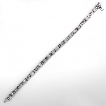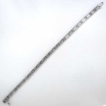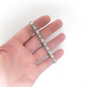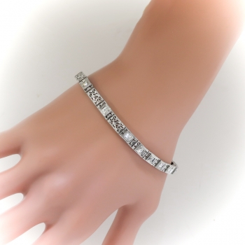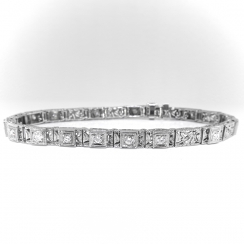 This bracelet will sparkle across a candlelit dinner table and transcend you to the swinging 30's! An affordable and glittering 14k white gold and diamond filigree line bracelet, of hand-made construction, circa 1930's. The bracelet measures 7 ¼” long (will fit a 6.75" inch wrist best!) and comprises 5.00 mm wide filigree links, 15 bead-set with round transitional cut diamonds within square mountings, terminating in a hidden pressure clasp with fold-over safety catch. The antique cut diamonds are VS1-VS2 in clarity, G-H in color, cut grade: good, measure an approximate average of 2.50 mm in diameter, and weigh approximately 0.06 carats each. Approximate total gem weight: 0.90 carats. The clasp is stamped with an illegible five-digit number and has US origin. It has been entirely tested and guaranteed to be 14k white gold and weighs 12.8 grams. Jewelry Finds® offers shortening of bracelets on a case by case basis so please inquire :). I will be more than happy to email this piece's current certified and guaranteed retail replacement appraisal upon completion of sale, just ask! Questions are welcomed on Bracelet-2600.