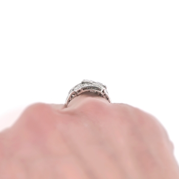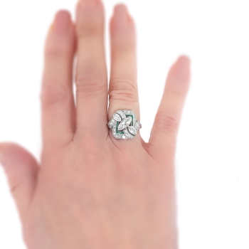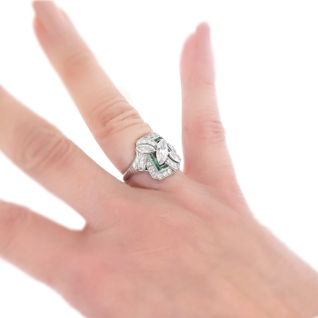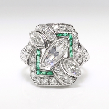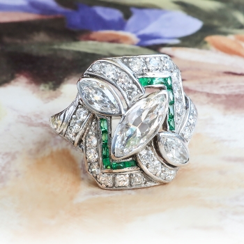 This exceptional 1930's Art Deco marquise, antique cut diamond and calibre' cut natural emerald ring is a show stopper! No one will have this ring, and it will make an outstanding alternate engagement ring or anniversary ring. This ring features a central antique marquise cut diamond measuring 10mm x 4.5mm and weighs approximately .70cts. That diamond is white, extremely brilliant (hence why I couldn't get a great head-on shot of this ring because it sparkled so much!) and has the quality grade of G color, SI1 clarity. That diamond is adorned by two antique marquise cuts each weighing approximately .225cts each that have the quality range of G-H color, VS1 clarity. In addition to those unique fancy antique cut diamonds are .52ct t.w. of antique single cut diamonds with comparable quality (G-H color, VS2-SI1 clarity). A grand total diamond carat weight of 1.67ct t.w.. This ring also has a rectangular halo of natural calibre cut emeralds (.20ct t.w.). Those gems add charm and color to this sensational Art Deco heirloom ring. The emeralds have era appropriate wear so be sure not to wear this ring while doing the dishes or playing tennis as emeralds are soft gemstones! This ring has a grand total gem and diamond weight of 1.87ct t.w.. This ring is large, measuring an impressive 18mm North to South, 16.7mm East to West, and is raised 4.5mm off the finger. This ring is made entirely in platinum and has elegant subtle hand engraving on the shank halfway down. It has been well loved and preserved for over 80 years! This ring weighs 6.5 grams, is a finger size 7, and for a flat $75 platinum sizing fee I can have my trusted jeweler sagely re-size that and will take 3-7 business days, just message me to set that up prior to checking out. I will be more than happy to send a current retail replacement appraisal upon completion of sale, just ask! Questions are welcomed on Ring-1455.