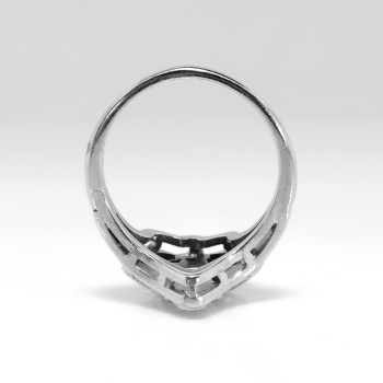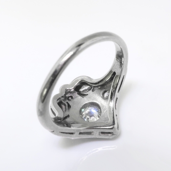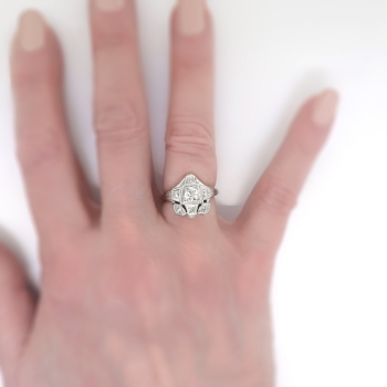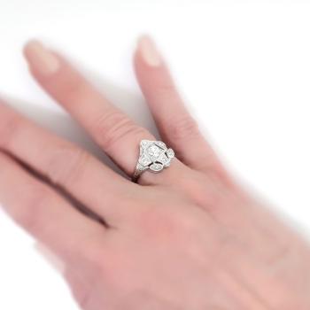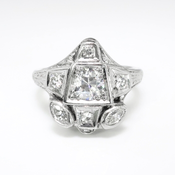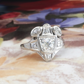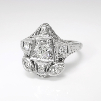 This funky Art Deco ring has so much sparkle and unique elements! No one will have this ring! It has hand engraving, mixed cut antique diamonds, crisp milgrain work, and a heavy and sturdy design. Wear it on any finger! This ring features a central chipped (but still sparkly and big) approximate .46ct I color, I1 clarity (it would be SI1 without the chip, the old European cut diamond is blinding!) and is adorned by two bezel set marquise cut diamonds (.21ct t.w.) and an additional .13ct t.w. in single cut bead set diamonds. This ring has an approximate grand total diamond weight being .80ct t.w.. The accent diamonds have the quality grade range of H-I color, SI1-SI2 clarity. It measures 15.20mm North to South, 14.40mm East to West, and is raised 3.80mm off the finger. It has a shield shape and other than the chipped central diamond, is in excellent condition for being over 80+ years old! The ring weighs 4.8 grams, is 14k white gold (stamped and guaranteed) and is currently a finger size 6. Jewelry Finds® additional sizing up or down will be determined on a case by case basis so please inquire :). Ring re-sizing takes an additional 3-7 business days by a third party Master Bench Jeweler, not to worry! Your ring is in good hands! I will be more than happy to email this piece's current certified and guaranteed retail replacement appraisal upon completion of sale, just ask! Questions are welcomed on Ring-1921.