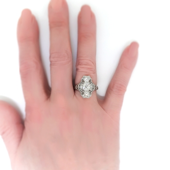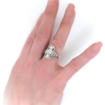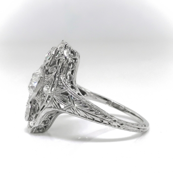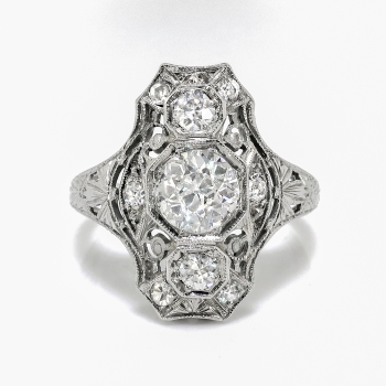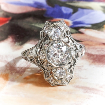 Straight from the 1920's comes this finely crafted Art Deco diamond dinner/cocktail ring handmade in 18k white gold. This heirloom ring is comprised of a filigree mounting measuring 18.78 x 12.33 mm bead-set with three Old European cut diamonds in octagonal frames, and throughout with six single cut diamonds, on an engraved shank which measures from 1.17 to 4.11 mm in width. The center diamond is SI2 in clarity, H-I in color, measures approximately 6.17 x 6.17 x 3.62 mm, and weighs approximately .88 carats. The smaller Old European cut diamonds are SI2 and SI1 in clarity, G-H in color, measure approximately 3.15 and 2.88 mm in diameter, and weigh approximately .11 and .09 carats each. The single cut diamonds are SI1-SI2 in clarity, G-I in color, measure an approximate average of 1.95 mm in diameter, and weigh approximately .03 carats each. Approximate total gem weight: 1.26 carats. The ring is stamped “18K”. Total weight: 4.0 grams. The ring is currently a size 7.25 and is resizable. Jewelry Finds® additional sizing up or down will be determined on a case by case basis so please inquire :). Ring re-sizing takes an additional 3-7 business days by a third party Master Jeweler. I will be more than happy to email this piece's current retail replacement appraisal upon completion of sale, just ask! Questions are welcomed on Ring-2187.