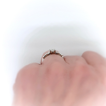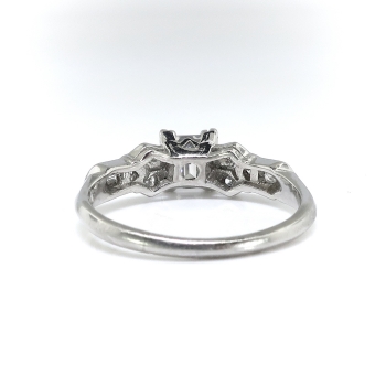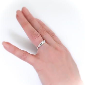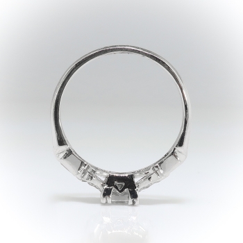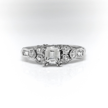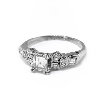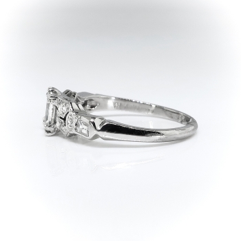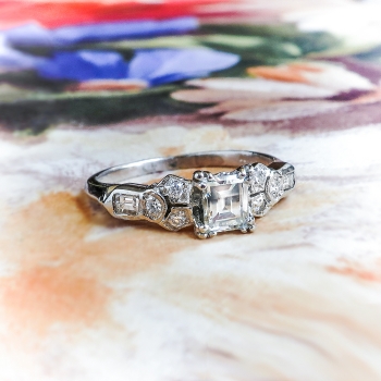 This antique diamond is unusual with it's sharp corners (think of a more square than rectangular step cut radiant diamond) and delicate setting. This is the perfect Art Deco engagement ring for a woman with petite fingers! The elements of hand engraving, filigree, unique style and setting will leave you breathless. The ring comprises a that vintage diamond set in four triple prongs, flanked by six round brilliant cut diamonds bead-set within individual geometric mountings and two rub-over-set baguette cut diamonds, on a knife-edge shank which measures from 1.40 to 2.61 mm in width. The square step cut diamond is I1 in clarity, G in color, measures approximately 4.50 x 3.77 x (2.26) mm, and weighs approximately 0.35 carats. The smaller diamonds are VS1-VS2 and G-H in color. The baguette cut diamonds measure approximately 2.23 x 1.81 mm and weigh approximately .06 carats each. The round brilliant cut diamonds are cut grade: good, measure an approximate average of 1.50 mm in diameter, and weigh approximately .015 carats each. Approximate total gem weight: 0.56 carats. The ring weighs 3.2 grams, is stamped “PLATINUM” and is currently a finger size 5. I can have my trusted jeweler re-size this for you, just ask! I can also email this piece's current retail replacement appraisal upon completion of sale, please inquire. Questions are welcomed on Ring-2318.
