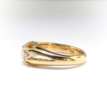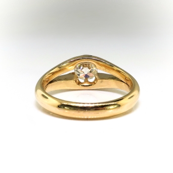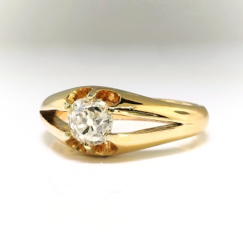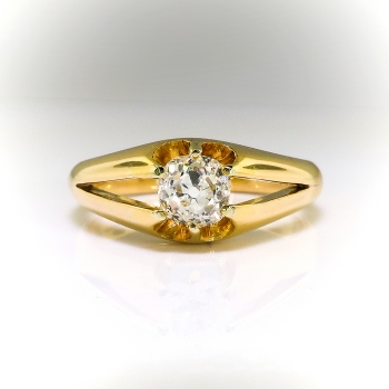 A simplistic antique solitaire in a six prong belcher style mounting for the true antique jewelry lover! The ring is made in a Victorian style, but was created in the 1930's in the UK. This unisex antique diamond solitaire is understated elegance at it's finest and will look amazing on a man or a woman! This ring is made entirely in solid 18k yellow gold, and comprises a split shank forming a modified belcher mounting at the center, holding a single old mine cushion cut diamond. The half-round ring tapers in width from 8.17mm at it's widest to 3.32mm . The beautiful fiery old mine cushion cut diamond ranges from H-I color, SI2 clarity, measures approximately 5.27 – 5.40 x 3.95 mm, and weighs approximately .72 carats. The ring is stamped “RG 18” and weighs 6.4 grams. This ring is currently a finger size 8 and my trusted jeweler can safely size it and will take an additional 3-7 business days, just ask! I will be more than happy to email a retail replacement appraisal upon completion of sale, just ask! Questions are welcomed on Ring-2233.