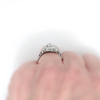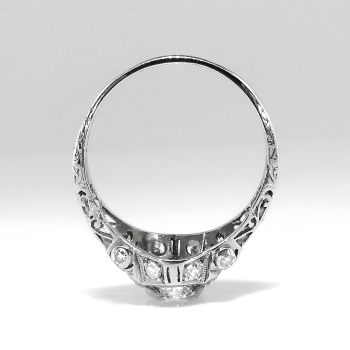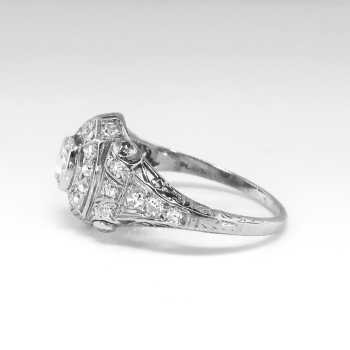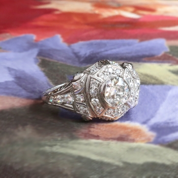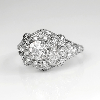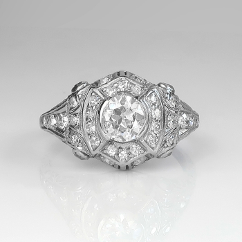 This precious heirloom engagement ring hails from the early 1930's and is waiting for one lucky lady! An original Art Deco engagement ring with a unique design and an array of incredible antique cut diamonds! The central old European cut diamond weighs approximately .45cts and has the quality grade of I color, I1 clarity. That diamond is surrounded by 34 gorgeous bead set old European cut and single cut diamonds that weigh approximately .02cts to .03cts each (.75ct t.w., I color, VS2-SI1 clarity) for an approximate grand total carat weight being 1.20ct t.w.. It is so unusual and special, no one will have this ring! This ring has elaborate filigree and hand engraving, and the shape is really unique! This ring measures 11.40mm North to South, 19.25mm East to West, and is raised 4.90mm off the finger. This ring is made entirely in platinum (stamped tested and guaranteed), weighs 3.3 grams, is currently a finger size 6.75 and Jewelry Finds® offers complimentary ring re-sizing + or - 2 sizes! The cost of additional sizing up or down will be determined on a case by case basis so please inquire :). Ring re-sizing takes an additional 1-5 business days. I will be more than happy to email this ring's current certified and guaranteed retail replacement appraisal upon completion of sale, just ask! Questions are welcomed on Ring-1873.