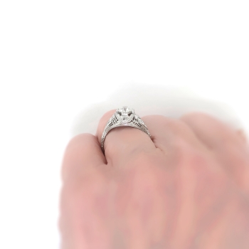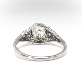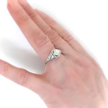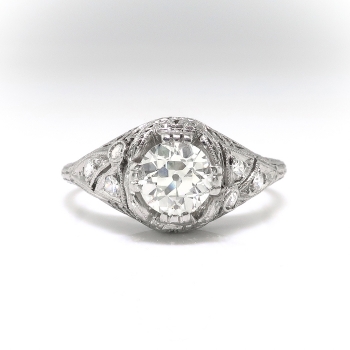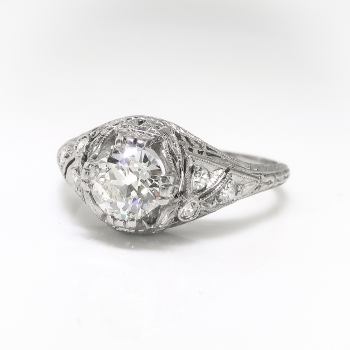 This Art Deco diamond engagement ring from the 1920's is of handmade construction and is just full of elegant detail like filigree and delicate milgraining. The ring comprises a filigree dome mounting measuring 9.00 mm wide at the center, set with one Old European cut diamond in four wide prongs, with six single cut diamonds bead-set throughout, on a half-round shank which measures from 1.45 to 2.75 mm in width. The center diamond is SI1 in clarity, I-J in color, measures approximately 5.60 – 5.64 x 3.38 mm, and weighs approximately .68 carats. The smaller diamonds are VS2-SI2 in clarity, H-I in color, measure from approximately 1.68 to 1.82 mm in diameter, and weigh an approximate average of .02 carats each. Approximate total gem weight: .80 carats. The ring is stamped “CERTIFIED PLATINUM” (tradename for William B. Ogush NY) and is currently a size 7.5. Total weight: 3.7 grams. Jewelry Finds® additional sizing up or down will be determined on a case by case basis so please inquire :). Ring re-sizing takes an additional 3-7 business days by a third party Master Jeweler, not to worry! Your ring is in good hands! I will be more than happy to email this piece's current retail replacement appraisal upon completion of sale, just ask! Questions are welcomed on Ring-2176.