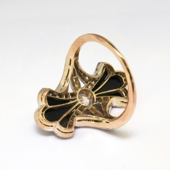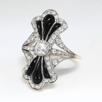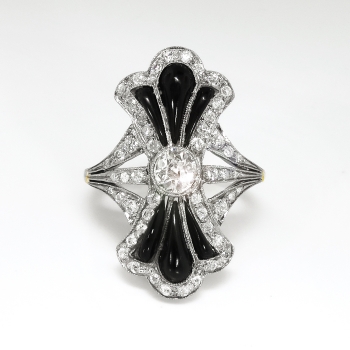 This immaculate natural black onyx and diamond ring is a knockout and will be a great conversation piece! This gorgeous Art Deco ring is made entirely in tested and guaranteed 14k white gold top with a 14k yellow gold shank. Adorn any finger with this finely made swinging 30's bauble! There are six cut to fit plume-like natural onyx that really give this ring something special to the eye! This outstanding ring is bezel set with an approximate .39ct old mine cut diamond that has the quality grade of K color, I1 clarity. That diamond is adorned by an additional 50 .01ct old European cut and single cut diamonds (.50ct t.w.) with the quality grade range of H color, I1 clarity. This ring has a grand total diamond weight of .89ct t.w.. This ring measures an impressive 27.37mm North to South, 19mm East to West, and is raised 5.55mm off the finger. This ring weighs 5.2 grams, and is currently a finger size 6.75. I can have my trusted jeweler safely re-size up or down two sizes free of charge and will take 1-5 business days, just ask (additional sizes up will be a flat $45.00 gold fee, just ask!). A fun, unique and one of a kind piece of history, only from Jewelry Finds! I will be more than happy to email a certified retail replacement appraisal, just let me know you’d like one when you receive it! Questions are welcomed on Ring-1862.