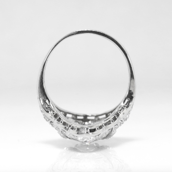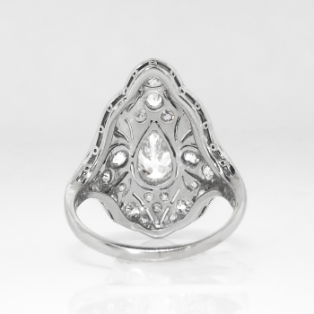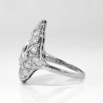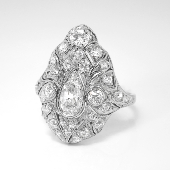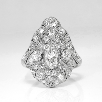 This unique and ornate beauty from the swinging 30's has beautiful execution and will truly set you apart! This ring has features a glittering and rare central .55ct antique pear cut diamond (measures 7.66mm x 4.30mm x 2.89mm) and has the quality grade of J color, VS1 clarity. In addition to that fun antique cut pear diamond are 25 dazzling old European cut and single cut diamonds that are safely bead set with hand engraving, swirling milgrain work and a true 'WOW' factor! Those diamonds have the quality grade range of H color, SI1-SI2 clarity, and weigh approximately .02cts to .19cts each with a combined total accent carat weight being .91ct t.w.. This ring has a grand total diamond weight of approximately 1.46ct t.w. but appears much larger with the workmanship and presentation! One of my favorite acquired treasures to date! This ring is stamped 'PLAT.NLM 10%IRID. ' and is made in the Art Deco standard platinum/iridium metal mixture. This ring measures a whopping 21.5mm North to South, 18mm East to West, and is raised 5mm off the finger. This ring weighs 5 grams, is currently a finger size 5.5 and my trusted jeweler can safely re-size this up or down to two sizes free of charge, just ask (additional sizes up over 7.5 will be a flat $75.00 platinum fee, just ask!). I will be more than happy to email a certified and guaranteed retail replacement appraisal upon completion of sale, just ask! Questions are welcomed on Ring-1869.