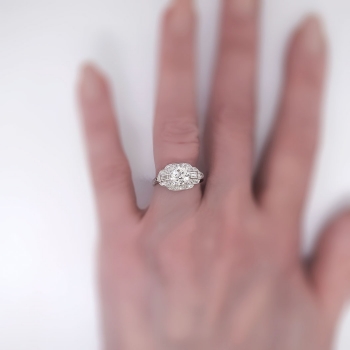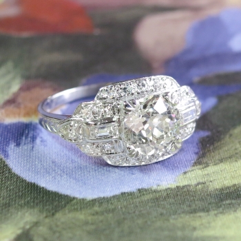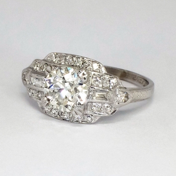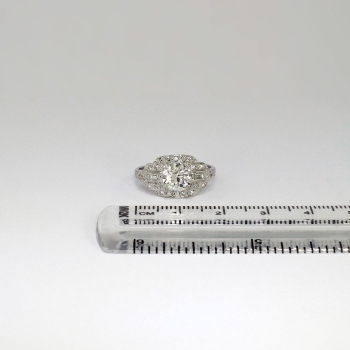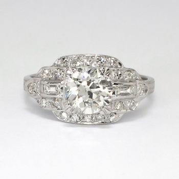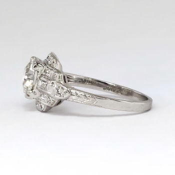 This sensational Circa 1930's platinum and diamond ring can be worn on any finger, for any occasion, and is an incredible value. A beautiful heirloom ring for one special lady in a desirable style of subtle filigree, an impressive halo of mixed cut bead set diamonds, and a twinkling large old European cut diamond central diamond all made in luxurious platinum. The central diamond weighs exactly 1.25cts and has the quality grade of J color, VS1 clarity. The center diamond measures 6.89mm x 6.86mm x 4.20mm approximately (chunkier old cuts weigh more though keep in mind as they are thicker/wider girdles). That diamond is adorned by 22 additional diamonds, all of which are baguette or single cut. Those diamonds have the quality range of H color, VS1-VS2 clarity, and have a combined accent diamond carat weight of approximately .31ct t.w..This ring has a grand total diamond weight of 1.56ct t.w. for the perfect 'not too big, not to small, just right' size. This ring measures 10.20mm North to South, 18mm East to West, and is raised 5.5mm off the finger. The perfect ring if you want an impressive low profile style. This ring weighs 3.3 grams, is currently a finger size 6.75, and my trusted jeweler can safely re-size this up or down four sizes, just ask! The band (shank) has subtle engraving on either side, and measures approximately 2mm wide. It is stamped '100 irid platinum', the standard platinum mix of 10% iridium and 90% platinum from that era, and has it's original script engraving of 'You and I 12/12' still intact (can be polished out upon request). Don't miss out on this sparkler from the swinging 30's! Questions are welcomed on Ring-1425.