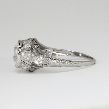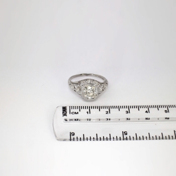 What a knockout! This insanely gorgeous engagement ring from the Art Deco era has been newly polished and looks incredible- not to mention it looks great on any finger too! This special 1930's era ring features a chunky glittery and unique old European cut diamond with a slight cushion shape. That diamond weighs exactly 1.60cts (weighed before re-setting with new bezel) and has the quality grade of K color, SI2 clarity. The new bezel my trusted jeweler delicately created makes the diamond look HUGE! That glorious diamond is safely bezel set in this platinum and diamond adorned filigree mounting. The platinum filigree work even glitters! The ten accent single cut diamonds have the quality range of H-I color, VS1-VS2 clarity, and weigh approximately .03-.06cts each for a grand total accent diamond weight in the mounting being .54ct t.w.. This ring has a grand total carat weight of an impressive 2.14ct t.w.. This ring measures 10.75mm North to South, and is raised approximately 8mm off the finger. This ring weighs 4.2 grams, is currently a finger size 8 and Jewelry Finds® offers complimentary ring re-sizing + or - 2 sizes! The cost of additional sizing up or down will be determined on a case by case basis so please inquire :). Ring re-sizing takes an additional 1-5 business days. I will be more than happy to email an insurance replacement appraisal upon completion of sale, please inquire. Questions are welcomed on Ring-1381.