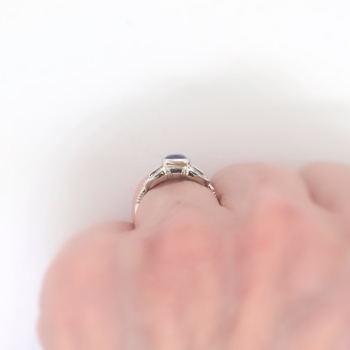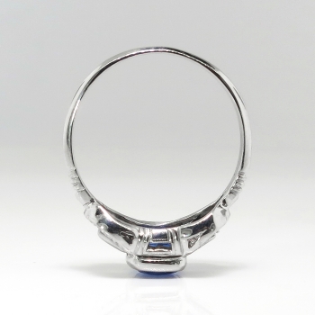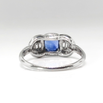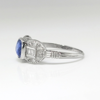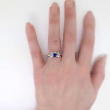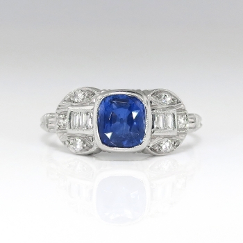 This is such a true and lovely 1930's sapphire and diamond ring! This ring has a stunning GIA certified (#6173684144) cushion cut sapphire with a perfect ceylon blue hue and mixed cut accent diamonds in a late Art Deco platinum hand engraved mounting. This ring features a central natural heat treated (95% of all sapphires are heat treated to enhance natural color) cushion cut sapphire that weighs exactly 1.18cts and has the quality grade of good cut and SI1 clarity. That precious gemstone is safely bezel set in an ornate era appropriate hand engraved mounting that has an additional 6 old single cut diamonds (.06ct t.w. G color, VS1-VS2 clarity) and four .01ct baguette cut diamonds (.06ct t.w. G color, VS1-VS2 clarity) for a total accent carat weight being .12ct t.w.. This sensational and timeless ring has a grand total diamond and gemstone weight of approximately 1.30ct t.w.. This ring measures 7.3mm North to South, 17.5mm East to West, and is raised 5mm off the finger. This tested and guaranteed platinum ring is stamped: 10%PLAT 90% IRID, weighs 2.6 grams, and is currently a finger size 6.5. My trusted jeweler can safely re-size this up or down two sizes free of charge and will take 1-5 business days, just ask! (additional sizes up or down will be a flat $75.00 platinum fee, just ask!). I will be more than happy to email you a current certified retail insurance replacement appraisal upon completion of sale, just ask! Questions are welcomed on Ring-1816.