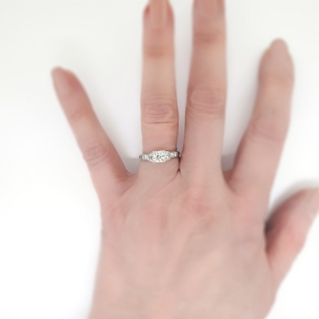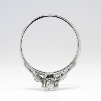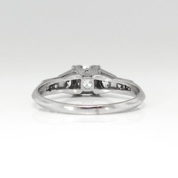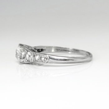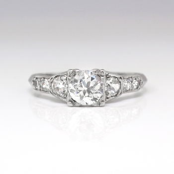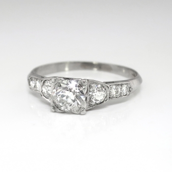 This platinum and diamond engagement ring is timeless! I see rings being made today in this particular Art Deco style, but acquire the real thing here! There is no comparison to a romantic Art Deco engagement ring! This ring features an approximate .45ct central old European cut diamond that has the quality grade of H color, I1 clarity. That glorious and glittering antique cut diamond is set in an elegant late 1930's diamond setting in platinum that is set with six additional bead set old European cut diamonds that have the quality grade range of H-I color, SI1-SI2 clarity. They weigh .03cts to .08cts each and have a grand total accent diamond weight of approximately .27ct t.w. This ring has an approximate grand total diamond weight being .72ct t.w.. This ring measures 5.27mm North to South, 17.25mm East to West, and is raised 5.25mm off the finger. This ring is tested and guaranteed platinum (stamped '10%IRIDPLAT'), weighs 2.8 grams, and is currently a finger size 6.25. My trusted jeweler can safely re-size this up or down two sizes free of charge and will take an additional 1-5 business days, just ask (additional sizes up will be a flat $75.00 platinum fee, just ask)! I will be more than happy to email a certified retail insurance replacement appraisal upon completion of sale, just ask! A beautiful, timeless, and affordable authentic 1930's platinum and diamond engagement ring for one lucky lady! Questions are welcomed on Ring-1826.