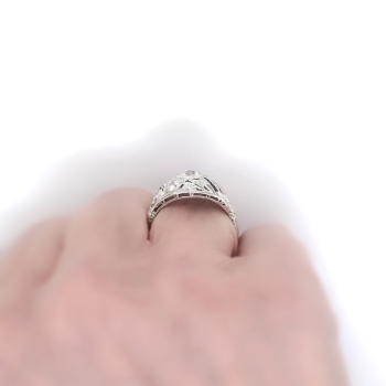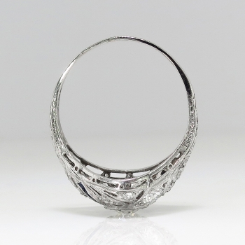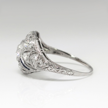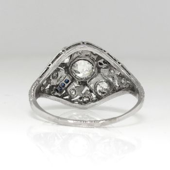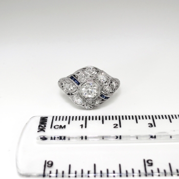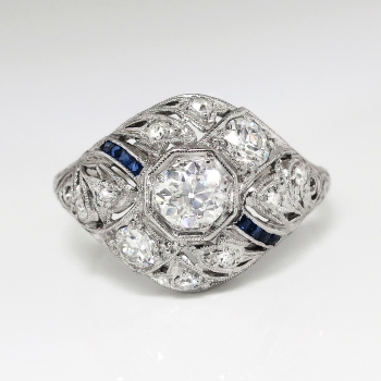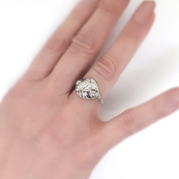 This is such an Art Deco beauty! This ring has a sparkly transitional cut diamond in a late Art Deco platinum, calibre' cut sapphire, and old diamond mounting. The setting has beautiful yet subtle open filigree work and a unique shape! This ring features a glittering old European cut diamond that weighs approximately .43cts and has the quality grade of H-I color, VS1 clarity. That diamond is safely set in an ornate era appropriate filigree and hand engraved mounting that has an additional eight old European cut and single cut diamonds (.46ct t.w. H-I SI1-I1 clarity) and eight .01ct French cut lab created blueberry blue sapphires that total approximately .08ct t.w.. In the Art Deco era, lab created sapphires were industry standard and a new technique that was very popular! This marvelous 1930's engagement ring has a grand total diamond and gemstone weight of approximately .97ct t.w.. This ring measures 13.64mm North to South, 20.5mm East to West, and is raised 5mm off the finger. This tested and guaranteed platinum ring is stamped: W&Co PLATIN....(rest is worn off), weighs 3.3 grams, and is currently a finger size 8.25. Jewelry Finds® offers complimentary ring re-sizing + or - 2 sizes! The cost of additional sizing up or down will be determined on a case by case basis so please inquire :). Ring re-sizing takes an additional 1-5 business days. I will be more than happy to email this ring's current certified and guaranteed retail replacement appraisal upon completion of sale, just ask! Make sure to watch the YouTube video to see every beautiful angle this ring has to offer! Questions are welcomed on Ring-1780.