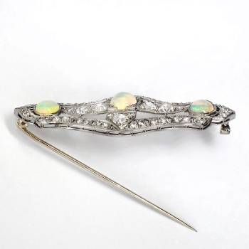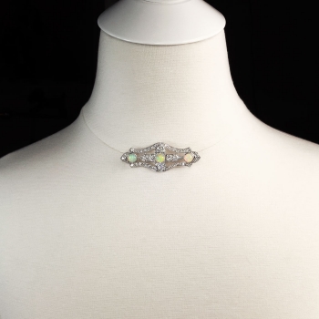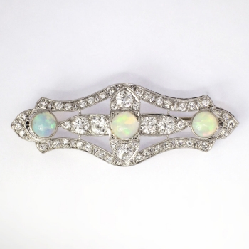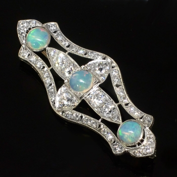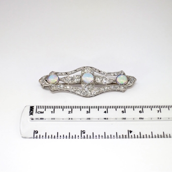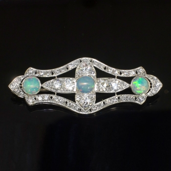 This immaculate opal, old European cut diamond, and platinum brooch/pendant from the swinging 30's will stop everyone dead in their tracks when you wear it! A true conversation piece from the Art Deco era with multiple ways to wear it! This beautiful brooch features three natural crystal opals measuring 6.5mm each and weighing an accumulative 2.76ct t.w.. Those opals have stunning vibrance and in perfect condition. The opals are safely bezel set in this enormous platinum and diamond encrusted brooch. The adorning chunky and twinkling old European cut diamonds sparkle beyond belief and enhance the opals perfectly! The diamonds range in size from .02cts-.48cts each and have the quality range of F-I color, VS1-SI2 clarity, and have an accumulative diamond weight of 3.41ct t.w.! This spectacular brooch has a grand total gem and diamond weight of 6.17ct t.w.! This brooch can be worn long as a pendant on a long chain, or on a dress or coat. My jeweler can add a folding bale at no additional charge, please inquire. This brooch weighs 8.5 grams, measures 2 9/16" x 7/8" inches overall and is a true museum piece. I believe this piece to have US origin and is made entirely in platinum. I will be more than happy to email this piece's current certified and guaranteed retail replacement appraisal upon completion of sale, just ask! Questions are welcomed on Pin-1413. (Chain pictured not included).