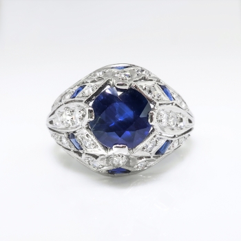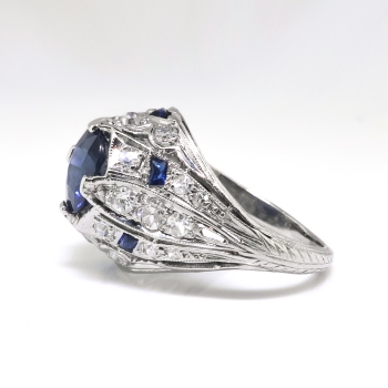 No you are not dreaming! This is a glittering 30's domed bauble perfect for the woman who wants a knock out engagement ring, romantic heirloom engagement ring, or a conversation piece! I have here a beautiful and authentic Art Deco era 1.53ct central re-worked natural sapphire (reworked means it was a vintage stone set into this authentic Art Deco setting). This outstanding ring is adorned with single cut diamonds and calibrated cut to fit sapphires in tested and guaranteed platinum. The most beautiful and intricate design I have seen that will make you stand out! The central blueberry blue sapphire is set in four prongs at the center of a filigree dome ring which measures from 1.57 mm to 13.65 mm in width, and which is bead-set throughout with 24 single cut diamonds (.70ctw) and channel-set with six rectangular and triangular calibre' cut blue lab sapphires (.30ctw). A grand total gemstone, diamond and lab gemstone carat weight of approximately 2.53ct t.w.. In the 1930's EVERYONE was using lab created sapphires in their pieces for a pop of color at a great value and looked excellent with filigree! Ot was a true fashion statement, so it just becomes that much more alluring as a piece of history! This ring is currently a finger size 5.5 Jewelry Finds® offers complimentary ring re-sizing + or - 2 sizes! The cost of additional sizing up or down will be determined on a case by case basis so please inquire :). Ring re-sizing takes an additional 1-5 business days. This would make a gorgeous right hand ring or anniversary ring as well! Jewelry Finds® offers complimentary ring re-sizing + or - 2 sizes! The cost of additional sizing up or down will be determined on a case by case basis so please inquire :). Ring re-sizing takes an additional 1-5 business days. I will be more than happy to email this piece's current certified and guaranteed retail replacement appraisal upon completion of sale, just ask! Questions are welcomed on Ring-880.