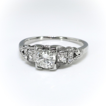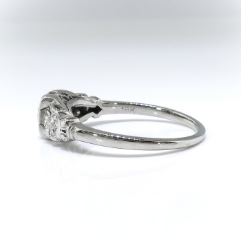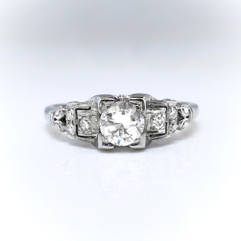 This is a transcendent engagement ring from the Art Deco 1930's era with subtle geometrical features and just the perfect amount of sparkle! This ring is made entirely in 18k white gold and is of cast construction. The ring comprises a transitional round brilliant cut diamond set in a four-prong illusion mounting, flanked by two single cut diamonds in square, milgrain-edged mountings, flanked in turn by two pairs of smaller single cut diamonds, on a half-round shank with scrolled shoulders, measuring from 1.25mm to 1.91mm wide. The central old transitional cut diamond is VS1 in clarity, I-J in color, cut grade: good, measures approximately 4.97mm x 4.97mm x 2.80mm, and weighs approximately .42 carats. The six single cut diamonds are VS1-VS2 in clarity, G-I in color, measure from approximately 1.45mm to 1.80mm in diameter, weigh from approximately .01cts to .02cts each, and have an approximate total weight of .08cts. This ring has a grand total diamond weight of approximately .50 carats. The ring is stamped “18K” and is white gold, weighs 2.6 grams, and is currently a finger size 7.5. Jewelry Finds® additional sizing up or down will be determined on a case by case basis so please inquire :). Ring re-sizing takes an additional 3-7 business days by a third party Master Bench Jeweler, not to worry! Your ring is in good hands! I will be more than happy to email this piece's current certified and guaranteed retail replacement appraisal upon completion of sale, just ask! Don't let this piece get away! Questions are welcomed on Ring-2218.
