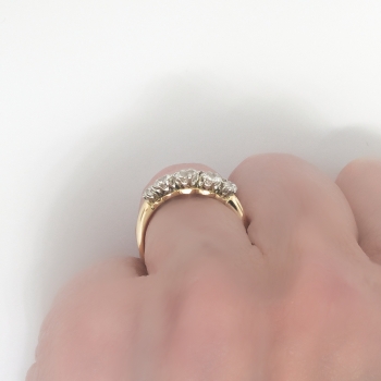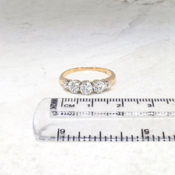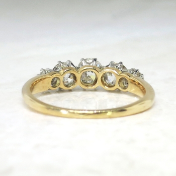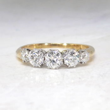 This ring is one of the finest five stone antique diamond rings I have ever laid eyes on! It is so glittering and pristine, it can stand alone as an outstanding engagement ring or anniversary band. It has five chunky and fine quality old European cut diamonds that have the quality range of H-I color, VS2-SI1 clarity. The central diamond weighs approximately .40cts, the two adorning diamonds on each side are approximately .30cts each, and the two end diamonds weigh approximately .08cts, for a grand total carat weight of approximately 1.16ct t.w.. The diamonds are regally set in eight platinum sturdy prongs, and a top a rich 18k yellow gold shank. The ring measures 5mm North to South, 17.25mm East to West, and is raised elegantly off the finger 4.5mm high. This ring weighs 2.9 grams, is currently a finger size 7 and my trusted jeweler can safely re-size this up to four sizes or down to two sizes free of charge, just ask! I will be more than happy to type of a retail insurance replacement appraisal, just ask! This ring has an indiscernible hallmark and is tested and guaranteed 18k yellow gold with platinum prongs. GORGEOUS! Questions are welcomed on this remarkable antique ring, Ring-1558.
