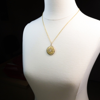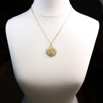 Such a rare locket from the early 20th century with the most gorgeous hand engraving on the back of someone's initials still intact. It's over 100 years old and is made in tested and guaranteed 18k yellow gold and platinum. This is an heirloom working diamond locket pendant, of hand-made construction. The locket measures 30.00mm in diameter and approximately 6.65mm thick. The hand raised metalwork is decorated with a flower pattern in platinum, bezel-set at the center with an old European cut diamond, and bead-set throughout with tiny rose cut diamonds, with a geometric border of round rose cut diamonds bead-set in platinum. The reverse is engraved with the letters “CA” or whatever you see haha. The central old European cut diamond is SI1 in clarity, H-I in color, measures approximately 2.75 mm in diameter, and weighs approximately .08 carats. The ninety-six (96) round rose cut diamonds are SI1-SI2 in clarity, G-I in color, measure an approximate average of 1.00 mm in diameter, and weigh approximately .005 carats each. Approximate total gem weight: .56 carats. The locket is unmarked. Total weight: 11.2 grams (total 13.9 grams with chain). I have included a modern 18k yellow gold oval cable chain necklace, 20” long, 2.00 mm wide, terminating in a spring ring clasp, stamped “Au750”. Jewelry Finds® offers complimentary shortening of chains. The cost of lengthening a chain will be determined on a case by case basis so please inquire :). I will be more than happy to email this piece's current certified and guaranteed retail replacement appraisal upon completion of sale, just ask! Questions are welcomed on Pendant-1975.