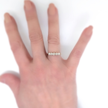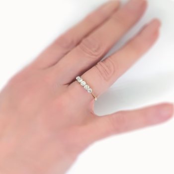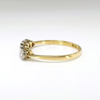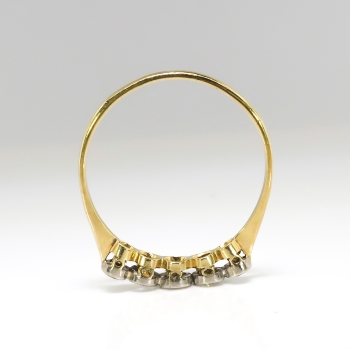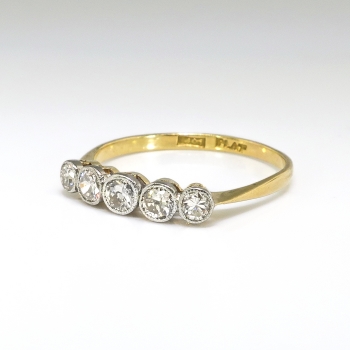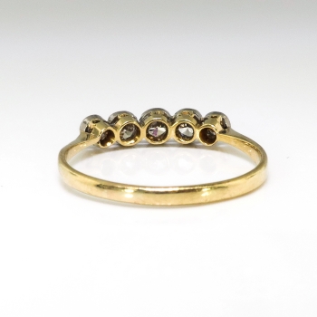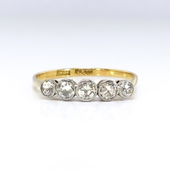 This ring is one of the finest petite antique five stone diamond rings I have ever laid eyes on! It is so glittering and pristine, it can even stand alone as an outstanding engagement ring or anniversary band. It has five chunky and fine quality old European cut diamonds that have the quality range I-J color, VS2-SI2 clarity. This ring is of 18k yellow gold, platinum, and diamond ring, of cast and assembled construction. The ring comprises five graduated round brilliant cut diamonds set in individual, millegrain-edged, platinum bezels, in a single row on a half-round, yellow gold shank which measures from .68 to 1.74 mm in width. The diamonds are VS2-SI2 in clarity, I-J in color, cut grade: good, measure from approximately 2.65 to 3.09 mm in diameter, weigh from approximately .07 to .10 carats each, and have an approximate total weight of .44 carats. The ring is stamped “18C PLAT” and is currently a size 8.5. Total weight: 1.8 grams. Just GORGEOUS! Jewelry Finds® additional sizing up or down will be determined on a case by case basis so please inquire :). Ring re-sizing takes an additional 3-7 business days by a third party Master Bench Jeweler, not to worry! Your ring is in good hands! I will be more than happy to email this piece's current certified and guaranteed retail replacement appraisal upon completion of sale, just ask! Don't let this piece get away! Questions are welcomed on this remarkable antique ring, Ring-2059.