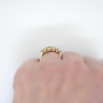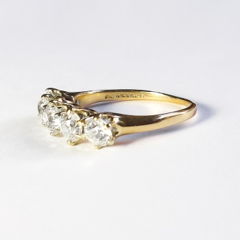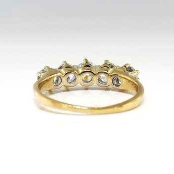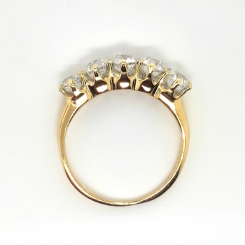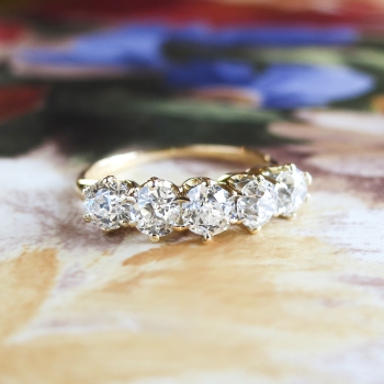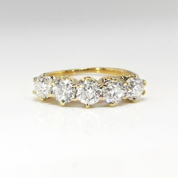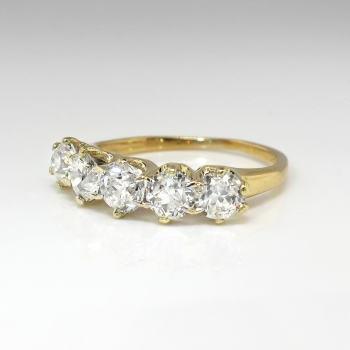 This ring is one of the finest five stone antique diamond rings I have ever laid eyes on! It is so glittering and pristine, it can stand alone as an outstanding engagement ring or anniversary band. It has five chunky and fine quality old European cut diamonds that have the quality range of F-G color, VS1-SI1 clarity. This outstanding ring has a grand total carat weight of approximately 1.38ct t.w.. The ring measures 5.13mm North to South, 18.70mm East to West, and is raised elegantly off the finger 5.08mm high. This ring weighs 3.3 grams, is currently a finger size 5.75 and my trusted jeweler can safely re-size this up or down two sizes free of charge and will take 1-5 business days, just ask! I will be more than happy to type of a retail insurance replacement appraisal upon completion of sale, just ask! This ring is stamped with the hallmark 'AJ&CO 18k' and is tested and guaranteed 18k yellow gold. The band is bent from wear from being over 100 years old but my trusted jeweler will safely re-round it, not to worry! Just GORGEOUS! Questions are welcomed on this remarkable antique ring, Ring-1801.