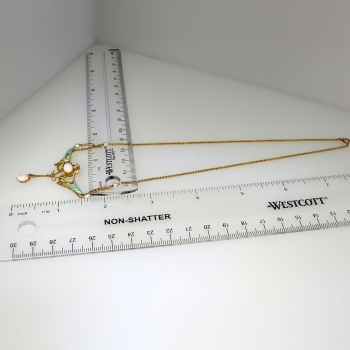 This original Art Nouveau era piece has it all; opals, an antique cut diamond, pearls, enamel work, and is all original from the early 20th century. This piece weighs 7.2 grams and has a length of 15 inches. The large opal is 6mm x 8mm in size, and the smaller opal is 5mm x 6mm. The opals have lots of fire and are in wonderful condition for being over 100 years old! There are 6 small seed pearls and a .02ct old mine cut diamond. Beautiful enamel work, and a little sparkle and the softness of pearls makes this necklace a wonderful piece of history to own. This necklace is made entirely in 14k yellow gold. Layaway and questions are welcomed.