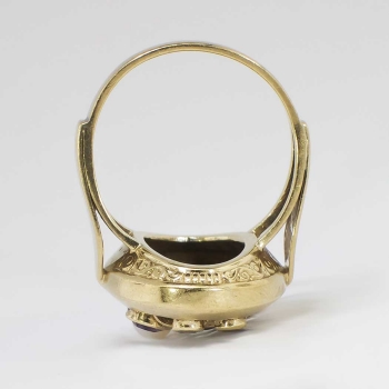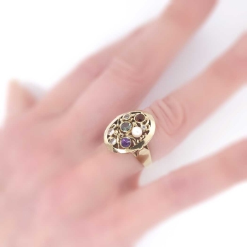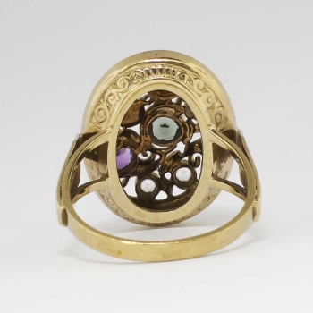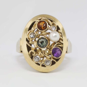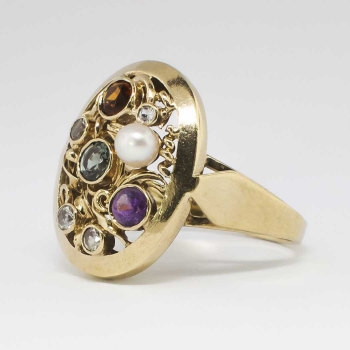 A fun and vintage cocktail ring for the woman who has everything! A beautiful European ring from the 1950's and in wonderful condition for an attainable value, only from Jewelry Finds! This 8k ring has hand engraving and a large look with semi precious gemstones ( Citrine, Amethyst, White Spinels and a 3mm Pearl). This ring measures 20.5mm North to South, 16.75mm East to West, and is raised 6mm off the finger. This ring is currently a finger size 7.25 and my trusted jeweler can size this up or down four sizes, just ask! A fun, colorful, and interesting piece from our past! Questions are welcomed on Ring-1339.