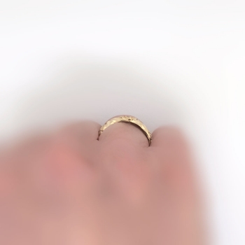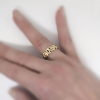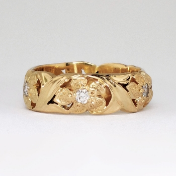 This timeless design features this floral and leaf eternity design which made them famous. This ring is solid (8.1 grams) 18k rose-yellow gold and features five round brilliant .05ct diamonds for a grand total diamond weight of .25ct t.w.. Those diamonds are G color, VS1-VS2 clarity. This ring measures a substantial 6.83mm wide. This particular ring was made sometime in the 1950's and has been previously sized. It is a finger size 8.5 and my trusted jeweler can safely re-size this down two sizes or up four sizes safely, just ask! Wear this ring alone or stack it with thin diamond bands. It would make a beautiful wedding band or alternate engagement ring. Questions are welcomed on Ring-1471.