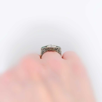 Wow! Sparkling antique cut diamonds and natural green emerald accents in a swirl of antique filigree work. This is the engagement ring you have been dreaming of! A special and articulate natural emerald and old European cut diamond engagement ring with the most beautiful and detailed filigree work and hand engraving! All crafted into this little piece of art! This ring is currently a finger size 6.25 and my trusted jeweler can easily re-size this ring up or down three sizes for a flat $45.00 gold sizing fee, just ask! This ring has a total of seven old European cut and single cut diamonds with a total diamond carat weight being approximately .49ct t.w. (.20ct central diamond). The diamonds have comparable quality being G-I color, SI1-SI2 clarity. Then on the outer edges of this tasteful era appropriate ring are calibre' cut natural green emeralds (.20ct t.w.). The top of the ring is 3/4" x 7/16", and the ring is made entirely in 18k white gold. The solid filigree work is truly breathtaking! The ring weighs 3.2 grams and is in excellent nearly antique condition! An amazing value, acquire this special engagement (or any kind of occasion!) ring today! Questions are welcomed on Ring-1064.