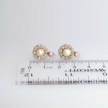 Attention Victorian jewelry lovers! Here is an authentic pair of cultured pearl ( each measuring approximately 5mm) and 22 fat sparkling old mine cut diamond earrings to be worn with anything! A comfortable euro-wire mounting with stunning hand finished work all made in a rosey-yellow 14k solid gold (approximately 5 grams combined weight). Such a pretty pair! The diamonds have a combined weight of approximately 1.20ct t.w. and they have the quality range of G-K color, VS2-SI2 clarity. They measure just under 1/2" inch each, and will be treasured for the next 100 years! They are in immaculate condition considering their age, and an amazing value. Only from Jewelry Finds! These are for pierced ears only. Questions are welcomed on Earrings-1052.