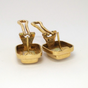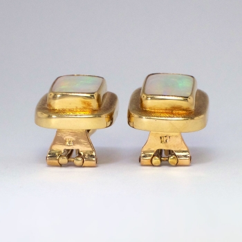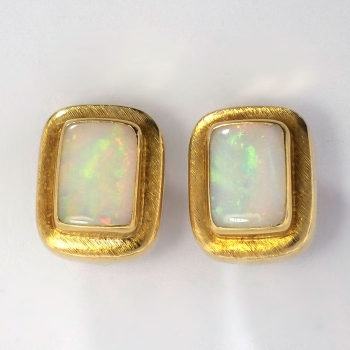 If you haven't heard of Burle Marx, acquire these earrings and open your eyes to true craftsmanship! Brazilian jeweler Haroldo Burle-Marx, born in 1911, was a mould-breaker in contemporary jewelry. He is a world-renowned innovative designer who is known for his hand carved masterpieces and bright colorful jewelry without diamonds to highlight the gems themselves. His work is held in such esteem that in 1955, Burle-Marx was commissioned by the Brazilian government to make pieces for visiting dignitaries and their first ladies! Since having passed, his pieces are continuing to grow in value and they are unsurpassed! These opal and 18k earrings are hallmarked and stamped and in perfect condition! These cushion emerald cut crystal natural opals have great color-play and will dress up any outfit of any style! The opals each weigh 2.5cts and measure 13mm x 9mm, and the earrings themselves measure 18.8mm x 15mm. They weigh 14.30 grams, are for pierced ears (or clip, just ask!) and have secure euro-backs for a secure fit. A one of a kind handmade pair for the Burle Marx collector, old or new! Questions are welcomed on Earrings-1479.
