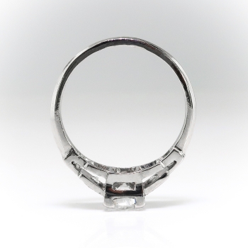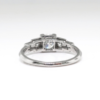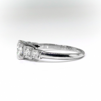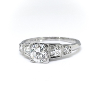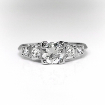 Dazzle her with this platinum and diamond engagement ring, of hand-made construction. The ring holds a round brilliant cut diamond set in a four-prong illusion mounting, flanked by four smaller round brilliant cut diamonds bead-set within square, millegrain-edged mountings, on a knife-edge shank which measures from 1.20 to 2.44 mm in width. The center diamond is SI2 in clarity, E-F in color, measures approximately 4.98 – 5.01 x 3.08 mm, and weighs approximately .47 carats. The four smaller diamonds are VS2-SI2 in clarity, F-G in color, measure from approximately 1.98 to 2.54 mm in diameter, weigh from approximately .03 to .06 carats each, and have an approximate total weight of .18 carats. A total carat weight of approximately .65. The ring is stamped “10% IRID.PLAT” and is currently a size 4.25. The ring rises about 4.8 mm off the finger. Total weight: 2.8 grams. Jewelry Finds® additional sizing up or down will be determined on a case by case basis so please inquire :). Ring re-sizing takes an additional 3-7 business days by a third party Master Jeweler. I will be more than happy to email this piece's current certified and guaranteed retail replacement appraisal upon completion of sale, just ask! Questions are welcomed on Ring-2170.