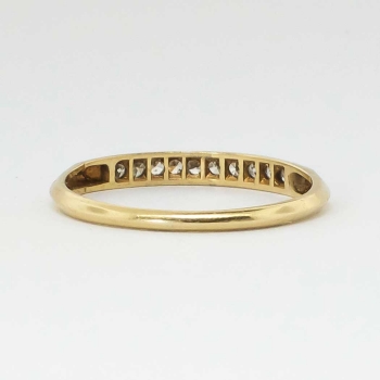 This hard to find vintage diamond wedding band will match that vintage engagement ring you've been trying to match! This band is 2.42mm wide, 1.5mm off the finger, and features 10 .02ct single cut diamonds that are I-J color, SI1-SI2 clarity, and channel set in a 14k mounting. The top holding the diamonds has a milgrain edge and is made in 14k white gold, while the shank is 14k yellow gold. This ring weighs 1 gram, is a finger size 5.75, and my trusted jeweler can safely re-size this up or down three sizes, just ask! Questions are welcomed on Ring-1395.