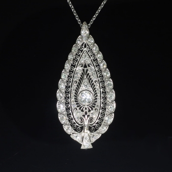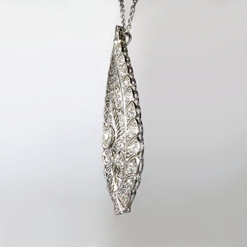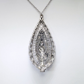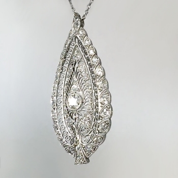 This large and elaborate glittering Edwardian pendant has all the things I love about jewelry from the early 20th century; twinkling old cut diamonds, open filigree-work, and luxurious platinum! This pendant measures 47mm North to South, 20mm East to West, and is 5mm thick. It is extended on an 18" inch platinum cable chain (can be extended by my trusted jeweler just ask!) and is absolutely one of a kind! The central diamond weighs approximately .53cts and is graded J color, SI1 clarity. In addition to that diamond are 38 bead set old European cut diamonds with the color range of I-J color, SI1 clarity. This pendant features 1.66ct t.w. and it's beautiful filigree work makes this piece hard to miss and especially stunning with a black cocktail dress! I can't be certain whether it is a peacock feather or a leaf motif; it's up to you to decide! This piece is made entirely in platinum and weighs 12.6 grams with the chain. Questions are welcomed on Pendant-1511.