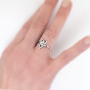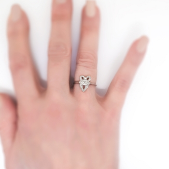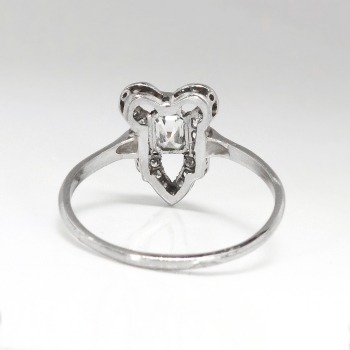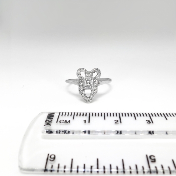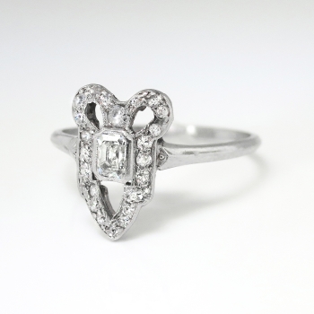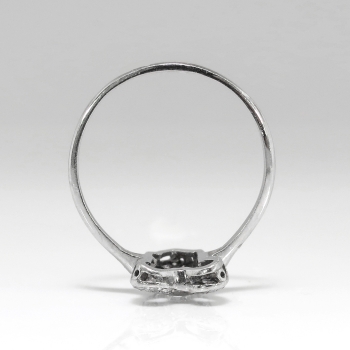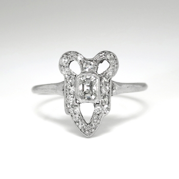 I couldn't resist acquiring this sweet and sparkly bow ring from the 1920's!!! This unique Edwardian find has a bow motif and a rare central emerald cut diamond. That diamond is graded H color, VS1 clarity, and weighs approximately.24cts. Surrounding that diamond are an additional 22 bead set single cut diamonds that are graded I color, SI1 clarity, and have a grand total carat weight of approximately .25ct t.w. This ring has a grand total diamond weight being .49ct t.w.. This adorable Edwardian bauble measures 13.33mm North to South, 9mm East to West, and is raised subtly 2.7mm off the finger for a low profile and petite special ring! This ring is made entirely in platinum (tested and guaranteed), weighs 3.1 grams, and is currently a finger size 7. I can have my trusted jeweler safely re-size this for a flat $75.00 platinum fee and will take 1-5 business days, just ask! I will be more than happy to email this ring's independent unbiased certified retail replacement appraisal in the amount of $2,000.00 upon completion of sale, just ask! Questions are welcomed on Ring-1700.