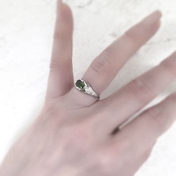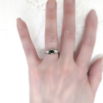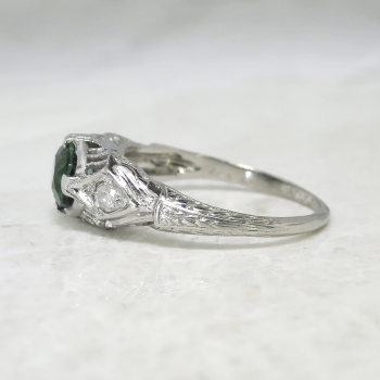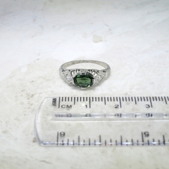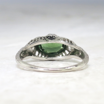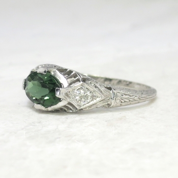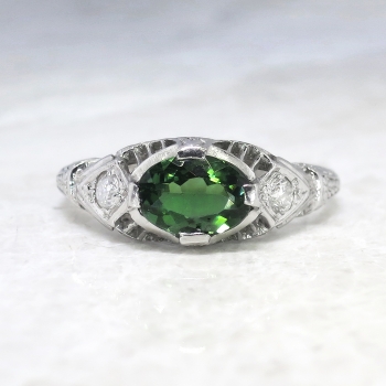 This elaborate and understated elegant petite East-West set green tourmaline and diamond ring is in fantastic condition and is a 100% original Edwardian ring! It will be a beautiful ring on a petite hand or a gorgeous pinky ring! The natural oval green tourmaline weighs .71cts, is graded VS clarity, has a blue-green hue (my favorite!), and measures 7mm x 5mm. That gemstone is adorned by two bead set single cut diamonds that are graded I color, SI2 clarity, and each weigh .05cts each. This ring has a grand total gem and diamond weight of .81ct t.w.. The platinum mounting is so intricate with the open-metalwork and stunning hand engraving. It even has the original inscription of 'HRH to MML 12.25.26' still intact! This ring measures 6.64mm North to South, 17mm East to West, and is raised 5.5mm off the finger. This ring weighs 2.4 grams, is currently a finger size 4.75, and my trusted jeweler can safely re-size this up to three sizes or down to two sizes free of charge, just ask! I will be more than happy to email a retail insurance replacement appraisal upon completion of sale, just ask! Questions are welcomed on Ring-1535.