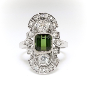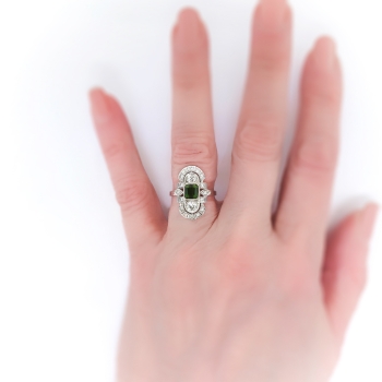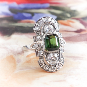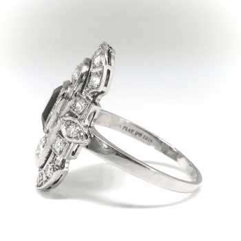 What a bright and beautiful trinket from the 1920's! This ring was crafted by 'C.D. Peacock'- Chicago's jeweler since 1837 which was known for their expert craftsmanship and this ring has clearly stood the test of time! This ring features a mesmerizing natural emerald-corner-step-cut green tourmaline that measures 5.52mm x 5.52mm x 3.65mm and weighs approximately .78cts. This ring has an array of old European cut and single cut diamonds that total approximately .76ct t.w. and have the quality grade range of G-H color, VS1-VS2 clarity overall: a grand total gemstone and diamond weight being 1.54ct t.w.. A phenomenal Edwardian ring for one luck lady! This ring measures 19.40mm North to South, 13.75mm East to West, and is raised 3mm off the finger for a low profile navette style Edwardian bombshell of a ring! This ring weighs 4.2 grams, is currently a finger size 5.25 US, and my trusted jeweler can safely re-size this ring. Jewelry Finds® additional sizing up or down will be determined on a case by case basis so please inquire :). Ring re-sizing takes an additional 3-7 business days by a third party Master Jeweler. The ring is stamped “900PLAT 100IRID” [partial] and “PEACOCK” [partial, C.D. Peacock, Chicago]. I will be more than happy to include a current retail replacement appraisal upon completion of sale, just ask! Questions are welcomed on Ring-1832.