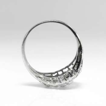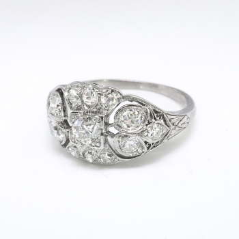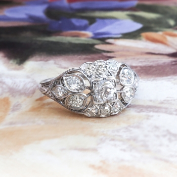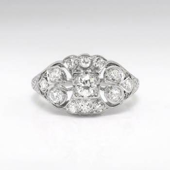 Such an extraordinary, delicate and blinding engagement ring from our past! Made entirely in platinum, this engagement ring hails from the 1920's and has beautiful bead set antique cut diamonds, floral engraved metalwork and a glorious central old European cut diamond that sparkles across a room! She will say yes to this one! The center mounting measures 9.85 mm wide and 5.12 mm deep, and comprises a center round [transitional] brilliant cut diamond set in an illusion mounting, with twelve round brilliant and single cut diamonds bead-set in individual geometric mountings throughout, on a half-round shank which measures 1.30 mm in width. The center diamond is SI1 in clarity, G-H in color, measures approximately 3.36 mm in diameter, and weighs approximately .15 carats. The smaller diamonds are VS1-SI2 in clarity, G-H in color, measure from approximately 2.00mm to 2.48mm in diameter, weigh from approximately .03 to .06 carats each, and have an approximate total weight of .48 carats. Approximate total gem weight: .63 carats. The ring is stamped “10% ID. PL” [partial] and has been entirely tested and guaranteed to be the standard 1920's Edwardian platinum mixture of 10% iridium, 90% platinum. This ring weighs 3.5 grams and is currently a size 5.75. Jewelry Finds® additional sizing up or down will be determined on a case by case basis so please inquire :). Ring re-sizing takes an additional 3-7 business days by a third party Master Jeweler, not to worry! Your ring is in good hands! I will be more than happy to email this piece's current certified and guaranteed retail replacement appraisal upon completion of sale, just ask! Questions are welcomed on Ring-2032.