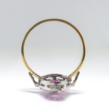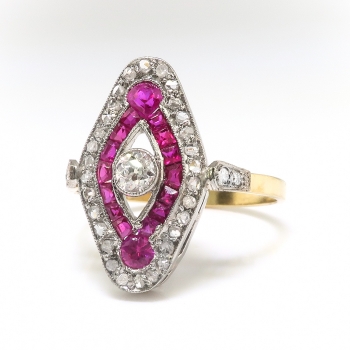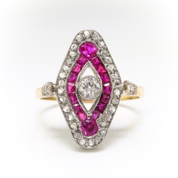 This bright and sparkling Edwardian era lab ruby and antique cut diamond ring is so unusual and eye-catching! This ring is made entirely in 18k white and yellow gold, with an array of bright synthetic rubies, and old rose cut and European cut diamonds. This is a hand-made ring made sometime in the late 1920's. The ring comprises a navette-shaped mounting measuring 18.55mm x 10.33mm, bezel-set at the center with an old European cut diamond surrounded by one pear mixed cut, one round mixed cut, and 14 square mixed cut lab rubies, surrounded in turn by 30 rose cut diamonds, all bead-set in white gold, with two round brilliant, one single cut, and one square modified brilliant cut diamond set into the shoulders of the flat, yellow gold shank, which measures 1.72mm wide. The central antique cut diamond is I1 in clarity, I-J in color, measures approximately 3.39mm in diameter, and weighs approximately .15 carats. The round rose cut diamonds are SI2-I2 in clarity, H-I in color, measure an approximate average of 1.16mm in diameter, and weigh approximately .005 carats each. The shoulder-set diamonds are SI1-SI2 in clarity, G-H in color, measure from approximately 1.20mm to 1.40mm in diameter, and weigh approximately .01 carats each. The synthetic rubies measure from approximately 1.65mmx 1.65mm to 3.12mm x 3.06mm, weigh from approximately .02cts to .14cts each, and have an approximate total weight of .52 carats. This ring has an approximate total gem weight: .86 carats. The ring is unmarked but tests 18k. This ring weighs 3.2 grams, is currently a finger size 7, and Jewelry Finds® additional sizing up or down will be determined on a case by case basis so please inquire :). Ring re-sizing takes an additional 3-7 business days by a third party Master Jeweler, not to worry! Your ring is in good hands! I will be more than happy to email this piece's current retail replacement appraisal upon completion of sale, just ask! Questions are welcomed on Ring-2208