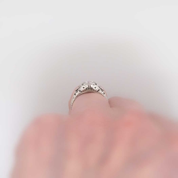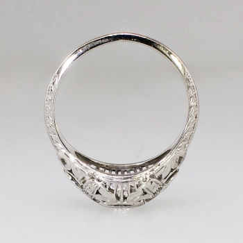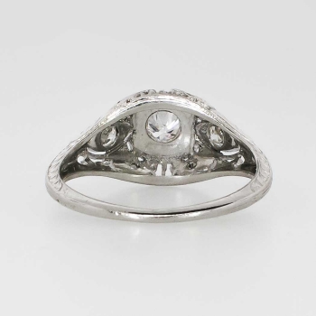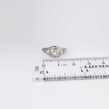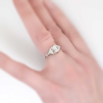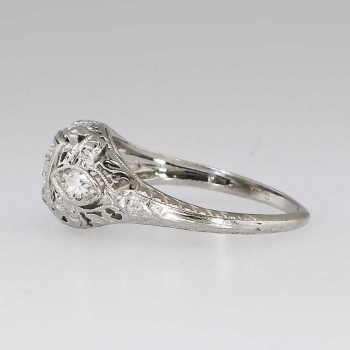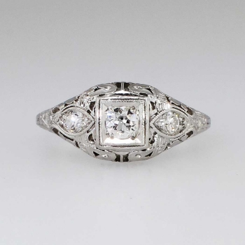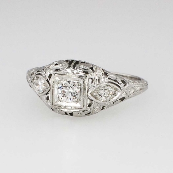 Such an extraordinary delicate and intricate engagement ring from our past! Made entirely in platinum, this engagement ring hails from the 1930's and has beautiful floral filigree work with subtle engraving and glittering antique cut diamonds! She will say yes to this one! The perfect Art Deco diamond ring for an amazing value, only from Jewelry Finds! This ring features a central old European cut diamond weighing an approximate .16cts. That diamond has the quality grade of H-I color, SI1 clarity. The diamond is adorned by two .03ct single cut diamonds, having comparable quality (G-H color, VS2-SI1 clarity) for a grand total carat weight being .22ct t.w.! This ring measures 8mm North to South, 16mm East to West, is raised 4.5mm off the finger, and is currently a finger size 4.5. My trusted jeweler can safely re-size this up or down three sizes, just ask! This ring weighs 2.9 grams and is made in solid platinum. What a beautiful ring! Questions are welcomed on Ring-1324.