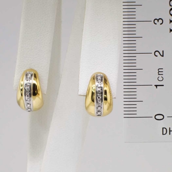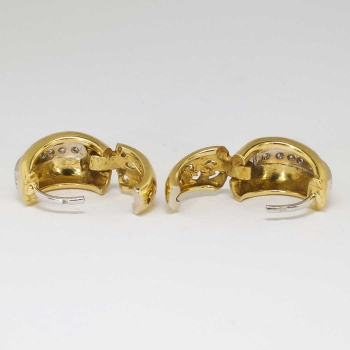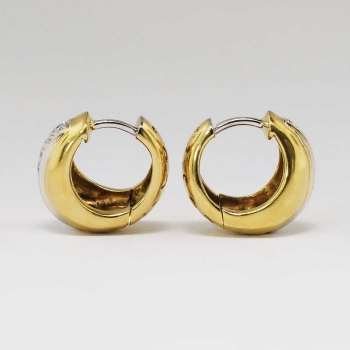 I adore this pair of 'Day to Night' diamond huggie snap hoop earrings! A tiny bit of sparkly (.05ct t.w.), solid 18k two tone gold (6.8 grams total weight) and an easy to wear design that can be worn any time for any occasion. These pierced only earrings are stamped: JMP ITALY 750. They measure 14.5mm North to South, 8.75mm East to West, and sit nice and snug on the ear. The tiny round brilliant cut diamonds are G-H color, SI1-SI2 clarity, and are bead set in 18k white gold to enhance the tiny sparkle effect. Just a great pair of estate earrings for a great value, only from Jewelry Finds! Questions are welcomed on Earrings-1352.