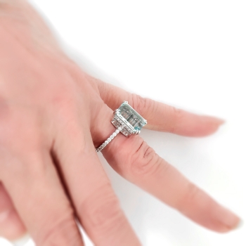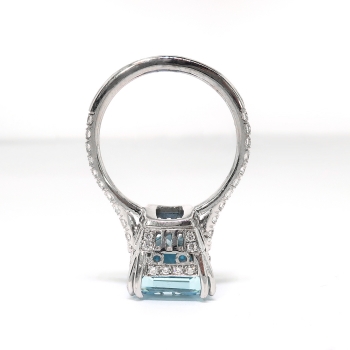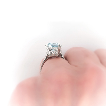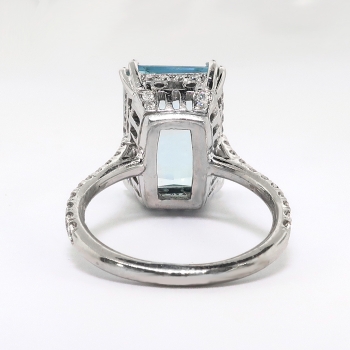 This is a handmade sky-blue aquamarine, platinum ring with lots of diamond frosting for your sweet tooth! The ring is made with an emerald cut aquamarine set in four double prongs atop an openwork gallery which is bead-set with thirty-two round brilliant cut diamonds, on a round shank which measures from 1.64 to 1.75 mm in width and which is surface-prong-set with twenty round brilliant cut diamonds. The aquamarine is eye clean, color: B05/5% Gray Mask, displays 30% brilliance, and weighs approximately 5.05 carats and measures 12.77mm x 9.46mm x 5.69mm depth (approximately) and is just pristine! It simply glows! The fifty-two diamonds are SI1-SI2 in clarity, G-H in color, measure from approximately 1.20 to 1.60 mm in diameter, weigh from approximately .01 to .02 carats each, and have an approximate total weight of .72 carats. Approximate total gem weight: 5.77 carats. The ring is unmarked and weighs 4.97 grams. The ring sits 9.39mm high off the finger. The current size is 5.25 US and Jewelry Finds® additional sizing up or down will be determined on a case by case basis so please inquire :). Ring re-sizing takes an additional 3-7 business days by a third party Master Jeweler. I will be more than happy to email this piece's current retail replacement appraisal upon completion of sale, just ask! Questions are welcomed on Ring-2197.