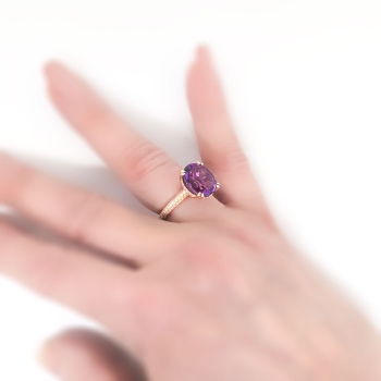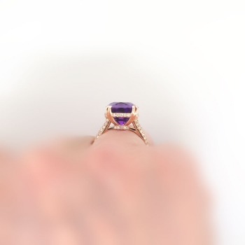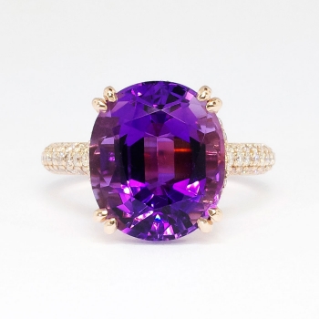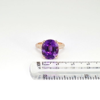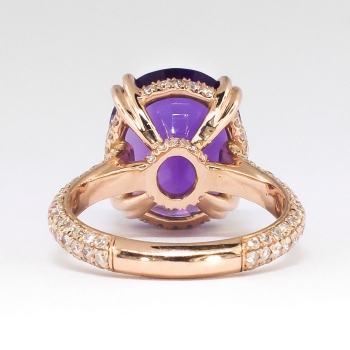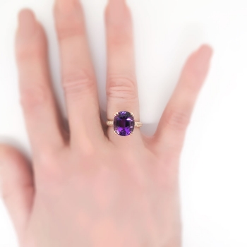 This phenomenal estate (1990's) bauble has glitz and glamour at every angle! This ring features a gem quality natural cushion-oval amethyst with gorgeous purple and magenta hues. That gemstone weighs approximately eight carats. That gemstone is double prong set with micro-set pave' diamonds everywhere! The .75ct t.w. in adorning diamonds are on the sides, under the gemstone, on the prongs, everywhere you look. Those diamonds are graded G-H color, VS-SI clarity. This ring has a grand total gem and diamond weight being 8.75ct t.w. This ring measures 12.35mm North to South, 12mm East to West, and is raised 9.4mm off the finger, This ring is made entirely in solid 14k rose gold and weighs 5.2 grams. This ring is currently a size 6.5 and my trusted jeweler can safely re-size this up four sizes or down two sizes free of charge, just ask! Questions are welcomed on Ring-1506.