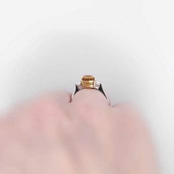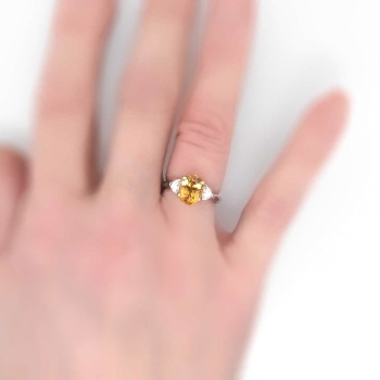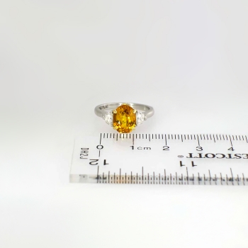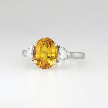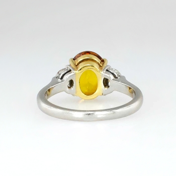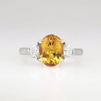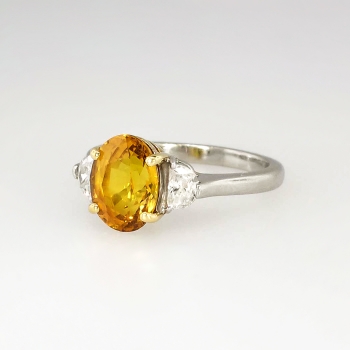 Here is a stunning circa 1980's estate yellow sapphire and moon shaped diamond accent ring to brighten your mood! Rich yellow sapphires such as this one are scarce, and with it's buttery golden color, you will think you are staring at a yellow diamond all day long! The ring is comprised of a center oval mixed cut yellow sapphire, set in a four-prong, yellow gold basket mounting, flanked by two half-moon cut diamonds, prong-set into the shoulders of the half-round, platinum shank which measures from 1.93 to 2.25 mm in width. The sapphire is eye clean, measures approximately 9.37 x 7.26 x 5.29 mm, and weighs approximately 3.02 carats. The two diamonds are SI1 in clarity, G-H in color, measure approximately 4.35 x 3.00 x 1.84 mm, and weigh approximately .18 carats each. Approximate total gem weight: 3.38 carats. The ring is stamped “18K PLAT.” The prongs holding the yellow sapphire and 18k yellow gold and the rest of the ring platinum. This ring weighs 5.5 grams and is currently a finger size 6.25. My trusted jeweler can easily re-size this knock-out of a ring for a flat platinum fee of $65.00; just ask! A graduate gemologist replacement appraisal in the amount of $4,000.00 will be emailed to you upon completion of sale. Questions are welcomed on Ring-1050.