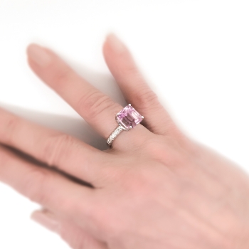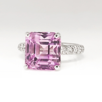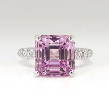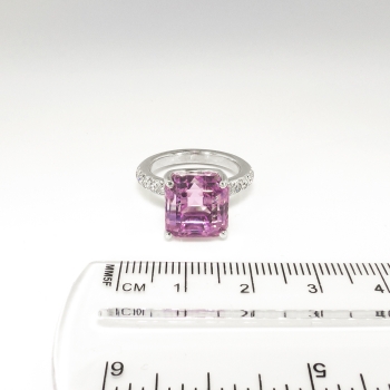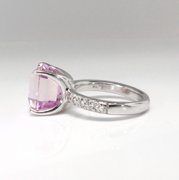 This gem quality kunzite is intense and simply gorgeous! An extraordinary estate find for one lucky lady! This circa 1990's fancy deep emerald cut natural kunzite measures 11.08mm x 10.61mm x 10.17mm and weighs approximately 9.51cts. The gemstone is in excellent condition with one tiny nick to the stone on the undercarriage closest to shank (does not deter from beauty or condition, please watch the YouTube video). The gemstone is a rich purplish pink and could double for a pink diamond! That glorious gemstone is adorned by 10 shared prong-bead set round brilliant cut diamonds that have the quality grade range of I color, SI1 clarity and total approximately .25ct t.w.. This ring has an approximate grand total gemstone and diamond weight being 9.76ct t.w.. The ring is made entirely in 18k white gold (stamped 18K Jt) and weighs 8.8 grams. This ring measures 11.21mm North to South, 22.5mm East to West, and is raised 10.63mm off the finger. A truly regal and gorgeous ring. This ring is currently a finger size 7 and my trusted jeweler can safely re-size this up or down two sizes free of charge and will take 1-5 additional business days, just ask (additional sizes up will be a flat $45.00 gold fee, please inquire). I priced this special ring pretty low because of the teeny tiny chip but don't let that deter you from acquiring this! If you love large gemstone rings don't miss out! I will be more than happy to include a current retail replacement appraisal upon completion of sale, just ask! Questions are welcomed on Ring-1788.