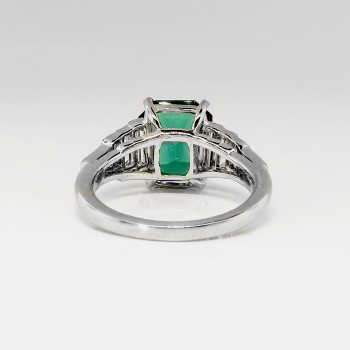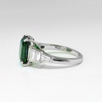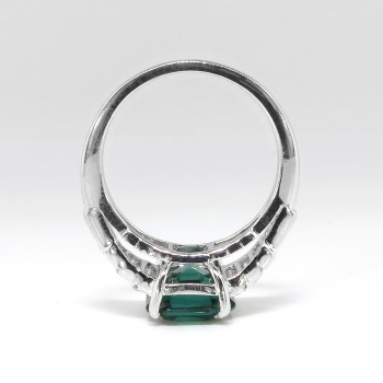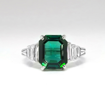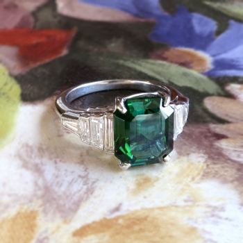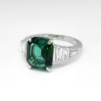This stunning estate ring is something old, something new, and hopefully something YOU! This estate Art Deco inspired setting (Circa late 1990's) with glittering baguette diamonds with subtle milgrain edging is made entirely in platinum (stamped and guaranteed) and features the most gorgeous natural Emerald cut verdelite Brazilian tourmaline I've ever seen! It would make an excellent alternate engagement ring as well! The stone weighs exactly 3.17cts and measures approximately 10 x 8.5mm. It has VVS1 clarity and the most gorgeous emerald green to green-blue hue you will ever see! This was almost a keeper for myself but I know someone out there has been dreaming for a ring like this! In addition to that gemstone are eight cut to fit bar set baguette cut diamonds that have the fine quality grade range of G color, VVS1-VVS2 clarity, and total approximately 1ct t.w.. This ring has a grand total gemstone and diamond weight of exactly 4.17ct t.w.. This ring measures 10.4mm North to South, 20mm East to West, and is raised 6.5mm off the finger. This ring weighs 6.2 grams, is made entirely in platinum (stamped PLAT), and is currently a finger size 6.25. My trusted jeweler can safely re-size this up or down two sizes and will take an additional 1-5 business days, just ask (additional sizes up from a 8.25 will be a flat $75.00 platinum fee, please inquire). Questions are welcomed on ring-1880.
