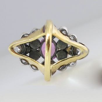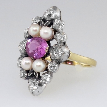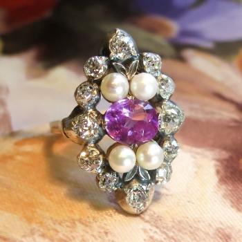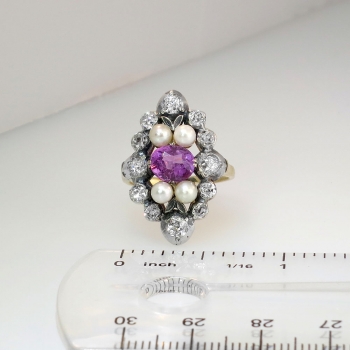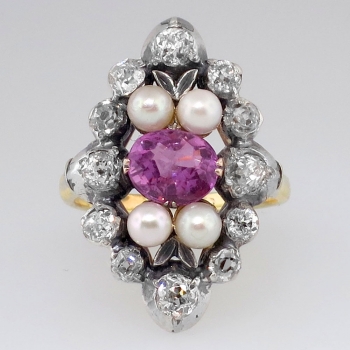 This exquisite antique multi-gem ring will make you feel like an Edwardian socialite! This ring has it all; old mine cut diamonds, cultured pearls, and a bright fine quality natural pink sapphire. This ring is set with an oval brilliant genuine pink sapphire in the center. This pink sapphire is a vibrant brilliant medium pink color, measures 7 x 5 mm and weighs 1 1/2 carats. There are four round cultured pearls set in this ring. These pearls measure 3.5mm in diameter each. There are also twelve genuine, natural round old mine cut diamonds set in this ring. These diamonds have the quality grade of H color, SI clarity and have an accumulative diamond weight of 1ctw. This ring is 14KT yellow gold with white gold holding the diamonds. This ring weighs 6.3 grams, is a ring size 5.5, and can easily be resized by a trusted jeweler. This ring measures 25mm in length along the finger and is just drop dead gorgeous! Layaway and questions are welcomed on this incredible cocktail ring.