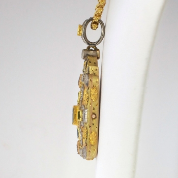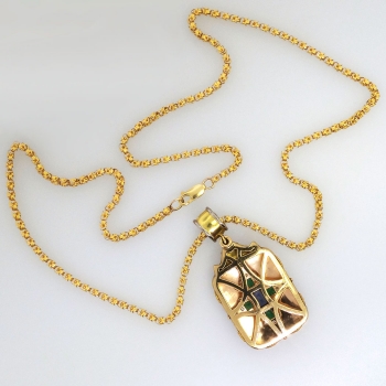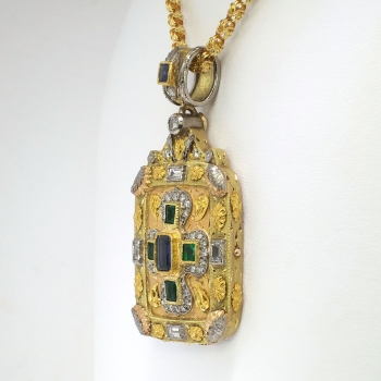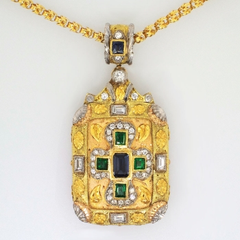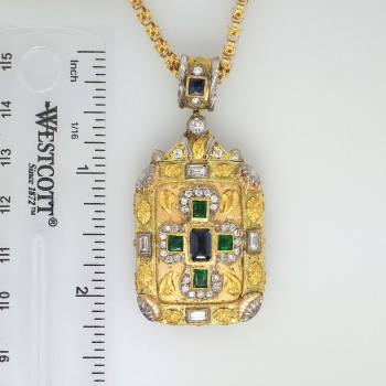 My jaw literally dropped when I found this piece! I love the florentine accents, tri-tone gold engraving and detail work, and the richly hued natural sapphires and emeralds. Not to mention it has a handful of twinkling diamonds and it is HUGE! If this doesn't sell by Christmas I am keeping this one for sure! This Circa 1990's estate piece features a solid 18k yellow, white, and rose gold pendant extended on a vintage 18k yellow gold chain. The pendant measures 2 ¼” x 1 1/16” overall, and comprises a brushed-finish, rectangular mounting bezel-set at the center with one emerald cut natural sapphire, surrounded by four bezel-set natural rich green emeralds, surrounded by twenty-eight bead-set round brilliant cut diamonds, with four baguette cut diamonds bezel-set into the frame, with one round brilliant cut diamond bezel-set at the top, the pendant suspended from a wide round bail bezel-set with one square French cut natural blue sapphire and two round brilliant cut diamonds. The four square step cut emeralds weigh from .09cts to .16cts each, and have an approximate total weight of .50ct t.w.. One emerald cut natural blue sapphires weighs approximately .83cts. The other French cut natural blue sapphire weighs approximately .20cts. The four baguette cut diamonds are graded G-H color, VS1-VS2 clarity, and weigh .07cts each (.28ct t.w.). The 33 round brilliant cut diamonds are graded G-I color, VS2-I1 clarity, and weigh .01cts to .09cts each. Those diamonds have an accumulative carat weight of approximately .51ct t.w.. This sensational estate pendant has a grand total gem and diamond weight of approximately 2.32ct t.w.. The pendant is unmarked but stamped 18k. It weighs 30.1 grams and would look great on anything from this chain I have included, or a leather chord! The chain is a stylish Byzantine link that measures 24.5" inches in length, measures 2.62mm wide, and weighs 15.9 grams. You won't find another similar piece ever, especially at this price point. Simply fabulous! Questions are welcomed on Pendant-1419.