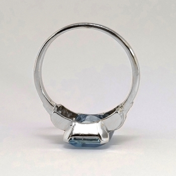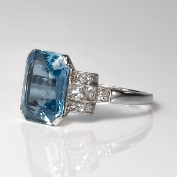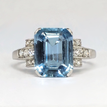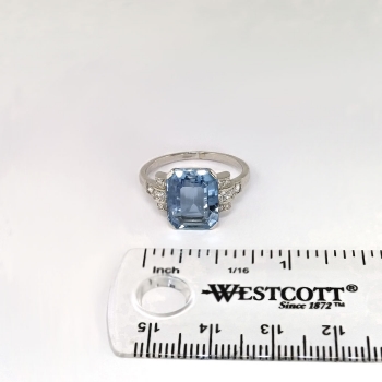 This glorious 1940's era ring came as a part of semi-parure (Necklace-1451). This would make the perfect wedding adornment, alternate engagement ring, or March birthstone ring! Don't miss out on this gem quality aquamarine set in platinum with twinkling diamonds. This ring was made in the 1940's, has US origin, and is in excellent vintage condition! The central natural emerald cut aquamarine measures 11.8mm x 9.38mm and weighs approximately 4.40cts. That incredible gemstone is adorned by 18 bead set single cut diamonds with a combined diamond weight of approximately .24ct t.w.. Those diamonds are graded H-I color, VS2 clarity. This ring has an approximate grand total carat weight of 4.64ct t.w.. This ring weighs 5 grams, is currently a finger size 7.5, and my trusted jeweler can safely re-size this up four sizes or down two, just ask! This ring measures 11.85mm North to South, and 17mm East to West. It is raised 6mm off the finger and has smooth edges for a comfortable everyday ring. Questions are welcomed on Ring-1447.