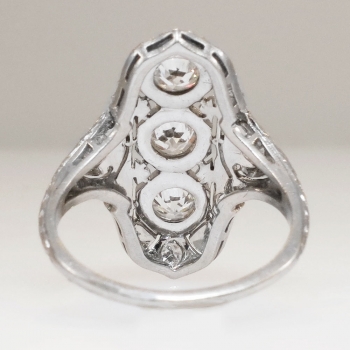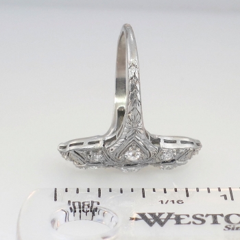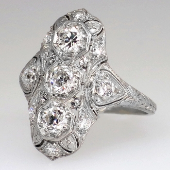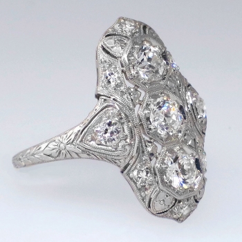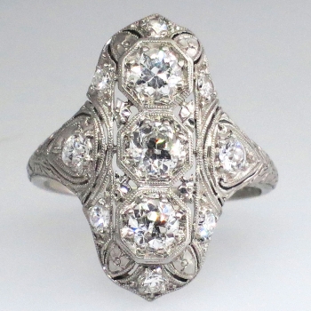 Transport yourself back in time with this gorgeous 'navette' diamond ring from the 1930's. It looks as if it was sitting in a jewelry box all these years! Beautiful intricate filigree work is portrayed on this stunning heirloom ring. The three main diamonds are approximately .25cts each, and have a wonderful quality of F-G color, VS1 clarity. Eight accent diamonds with comparable quality total approximately .50cts for a grand total of 1.25cts of glittering old European cut and single cut diamonds all perfectly set in solid platinum. This ring is currently a size 6.25 and can easily be resized by a trusted jeweler. It measures 3/4" inches long and has a lovely low profile. Easy to clean. A wonderful ring to add (or start!) to your collection.