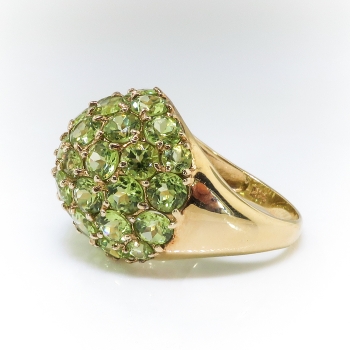 I almost kept this one! A fun and bright peridot dome ring from the 1990's- you can't go wrong! Are you an August baby and want something big and fun? This is the one to get. This estate ring comprises 39 round mixed cut peridots shared-prong-set in a dome-shaped mounting measuring 19.25mm in diameter and 10.32mm deep, on a polished shank which measures 2.60mm wide. The peridots are eye clean, measure from approximately 3.06mm to 4.18mm in diameter, weigh from approximately .12cts to .29cts each, and have an approximate total weight of 10.29 carats. The ring is stamped “© MQ 14K” [Marquesa Jewelry, Encino, CA]. This ring weighs a hefty 8.1 grams, is currently a finger size 8.5 US and Jewelry Finds® additional sizing up or down will be determined on a case by case basis so please inquire :). Ring re-sizing takes an additional 3-7 business days by a third party Master Bench Jeweler, not to worry! Your ring is in good hands! I will be more than happy to email this piece's current certified and guaranteed retail replacement appraisal upon completion of sale, just ask! Don't let this piece get away! Questions are welcomed on Ring-2215.