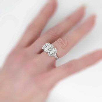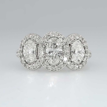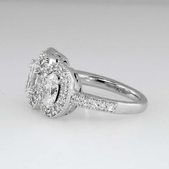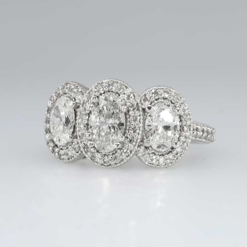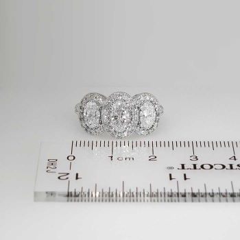 This knock out of an oval diamond halo style ring will leave you breathless. I know it does for me every time I try this beauty on! An impressive look, beautiful sparkling well matched diamonds, and perfect for the woman who wants a big look on a budget. It's the look of a $20,000.00 ring! The oval diamonds have comparable range of H-I color, SI1-SI2 clarity. Wonderful sparkle and very clean amazing diamonds! The central oval diamond is approximately .76cts, and the two adorning oval diamonds each weigh .59-.60cts. This ring feels great to wear, has a smooth shank, and sparkling shared prong set diamonds EVERYWHERE. The 54 round brilliant accent diamonds (G-H Color) each weigh approximately .01cts each, for an accumulative diamond weight being approximately 2.43ctw! I love the detailed workmanship underneath the ring, not to mention how much light it catches. This ring is made entirely in 14k white gold (8.9 grams!), and is in pristine pre-owned condition. This ring measures 11.65mm North to South, 22.88mm East to West, and is raised 5.8mm off the finger. This ring is currently a size 7.5 and can easily be resized by a trusted jeweler. The perfect engagement or anniversary ring! Get it here for an amazing value. An independent GIA Appraisal will be included with purchase. Hard to let this one go because it is just THAT AMAZING. Questions are welcomed.